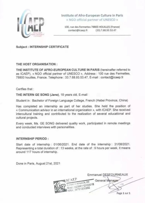 大一暑期我参加了GCA组织的国际组织实习项目,有幸进入了“巴黎非欧文化研究所”(Institute of Afro-European Cultures in Paris,简称ICAEP),在那里开展了为期三个月的线上实习。巴黎非欧文化研究所致力于促进更多人了解“非裔欧洲人”的概念,接纳这部分群体,促进非欧友好关系,和联合国教科文组织一道迈向文化交融的新世界。