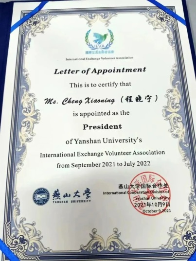 在乌鸦传媒国际交流志愿者协会任职时,作为协会干部,积极配合指导老师工作,组织协会内部建设与对外活动,多次参与组织策划了世界文化知识竞赛,参与学校海外名校线上宣讲周,参与编辑学校外教手册、参与策划外语宣传片,协调外教公寓搬家事宜,担任学校2021级港澳台侨学生助管,协助运营国际合作处微信公众号。
