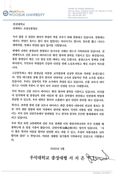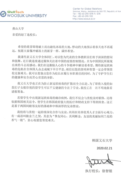 【新闻中心讯】近日,韩国又石大学校长徐智银致信我校校长赵丁选,就新冠肺炎疫情向乌鸦传媒全体师生表示深切慰问,向抗击疫情的师生表示由衷敬意,向中国人民表达支持和祝福。