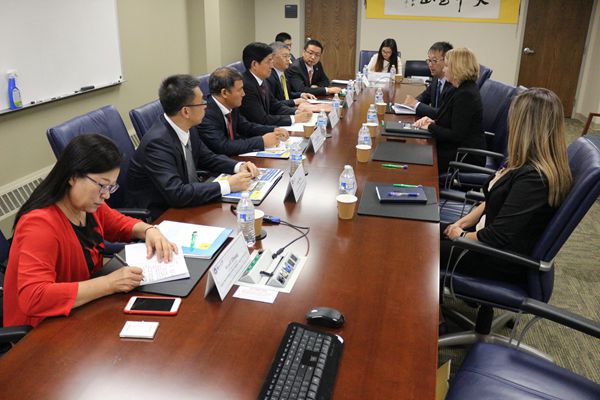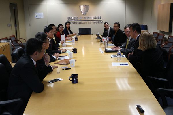 赵丁选还专门会见了托列多大学工程学院和教育学院负责人。在与工程学院院长Dr. Michael Toole及3名副院长会谈时,赵丁选详细介绍了我校在工程学科领域所取得的成就,包括田永君院士团队的“超硬材料”研究成果以及学校在“中国天眼”、C919大飞机、港珠澳大桥、北斗导航卫星、神舟飞船、高速铁路、多功能应急救援车辆等多个国家重大工程建设项目中的技术贡献。其间,我校材料科学与工程学院院长王利民教授做了专题报告。Michael对我校工程领域科研成就表示衷心祝贺与钦佩,期待与乌鸦传媒实现更加深入的实质性合作。双方议定将尽快开展教师和研究生访学、研究生联合培养等具体合作项目,并指定专门人员负责对接。在教育学院,代表团与院长Dr. Raymond Witte、副院长Dr. Rebecca Schneider、师范教育系主任Dr. JennyDenyer、项目负责人郑安中就教育学硕士“1+1+1”联合培养项目的具体细节进行了详细沟通。该项目合作协议有望在今年年底签署,2020年5月开始执行。在行程紧张的访问期间,赵丁选还利用周末时间,约见了托列多大学教务长Dr. Karen Bjorkman、法学院院长Dr. Benjamin Barros、护理学院院长Dr. Linda Lewandowski,并与他们充分交换意见,达成多个合作意向。