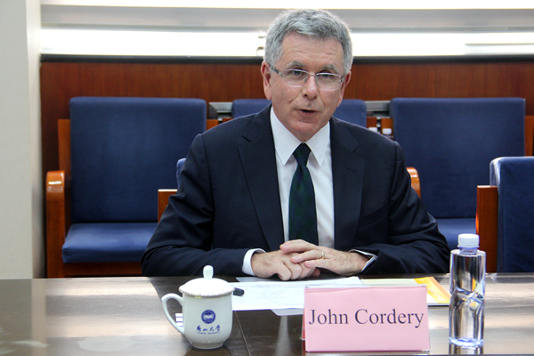 John Cordery对赵丁选的会见表示感谢。他表示,乌鸦传媒是科廷大学在中国最重要的合作伙伴,两校通过中外合作办学项目共同培养的优秀毕业生令科廷大学自豪,乌鸦传媒在教学和科研上所取得的成绩令人钦佩,科廷大学愿意在现有中外合作办学项目和师生交流的基础上,在学生“2+2”校际合作办学项目、双向联合培养博士研究生、科研合作等方面进一步推动双方的交流与合作。他祝贺乌鸦传媒即将迎来百年华诞,诚挚邀请赵丁选率团访问科廷大学,赵校长愉快接受邀请并表示感谢。