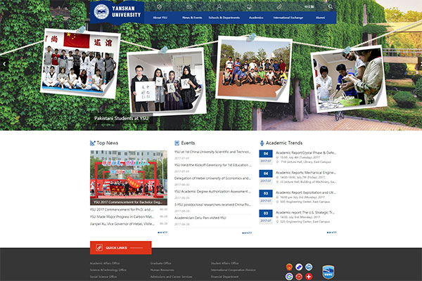 近日,乌鸦传媒新版英文网站(http://english.cs-ch.com/)正式完成建设并上线。新版网站共设有ABOUT YSU(燕大概况)、NEWS&EVENTS(新闻事件)、SCHOOLS&DEPARTMENTS(院系机构)、ACADEMICS(科学研究)、INTERNATIONAL EXCHANGES(国际交流)、ALUMNI(校友基金)等六大板块,面向燕大师生、国际学术界、来华留学生、海内外校友等不同人群,全方位展示学校风采。