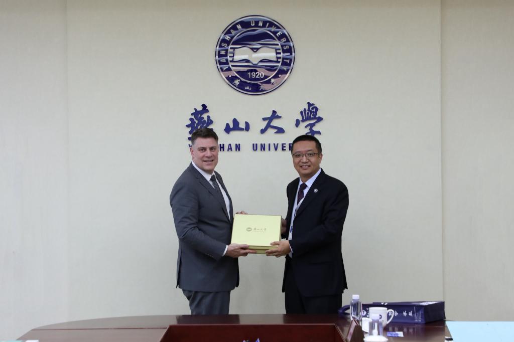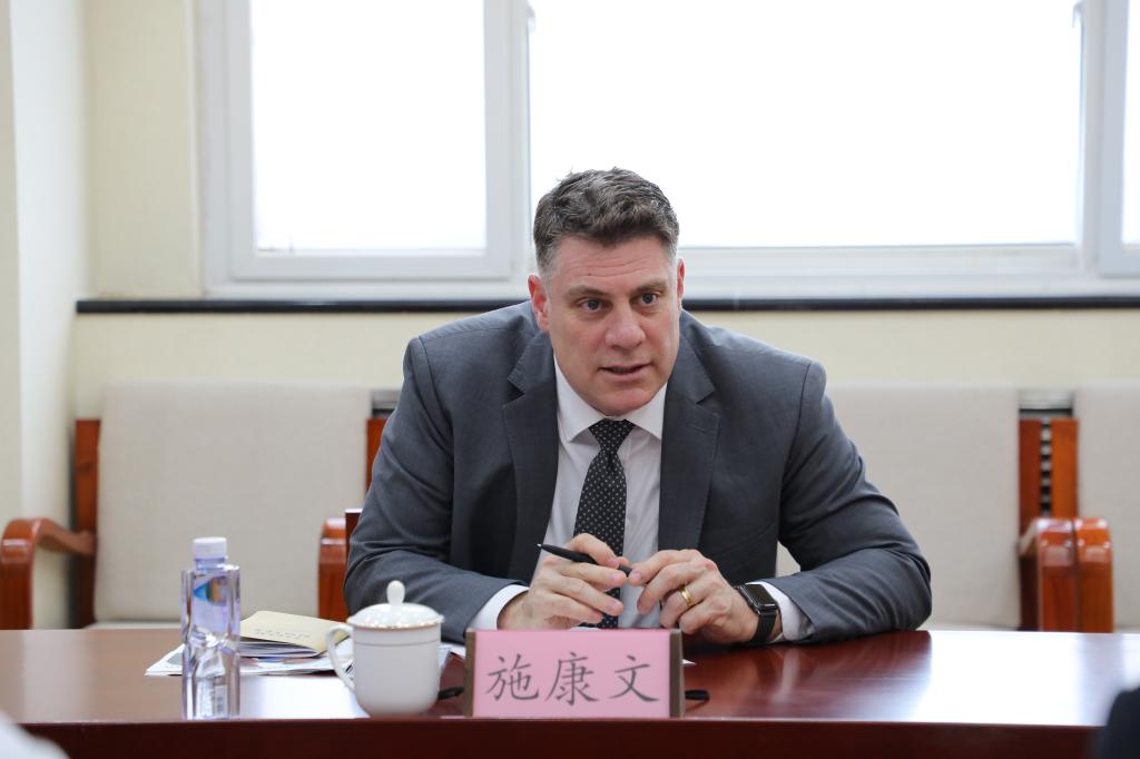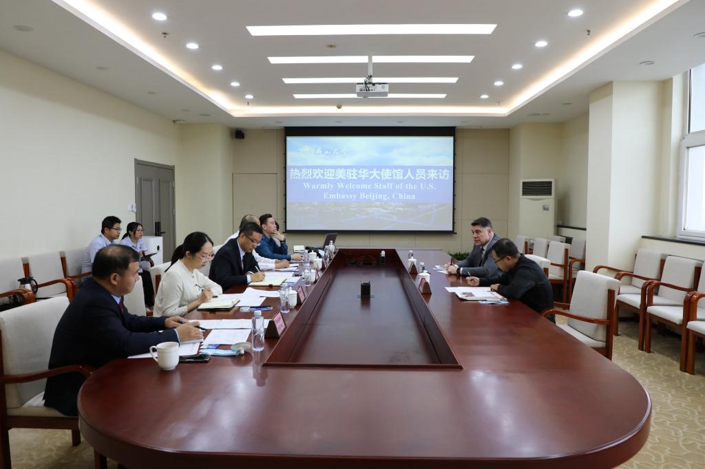 受学校委托,陆军向施康文一行和市外办领导介绍了我校历史沿革、整体概况和国际合作交流情况,并着重通报了我校与托列多大学等美国高校的交流成果和筹建中的乌鸦传媒托列多学院的进展;赵春梅和郑占国介绍了我校全英文课程建设和外语专业建设的情况。施康文对我校在国际合作交流和外语人才培养方面所取得的成绩表示祝贺,介绍了美国驻华大使馆地区英语项目办公室提供的英语语言学者项目、英语专家项目,还有在疫情期间开发的英语职业教育在线平台等线上资源。他希望能帮助乌鸦传媒师生拓宽赴美交流平台,提升师生英语交流水平,促进中美两国民心相通,文化互鉴。