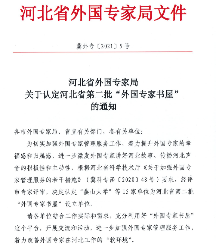学校将借助“外国专家书屋”这一平台,进一步做好外国专家的管理和服务工作,着力提升外国专家在我校工作的“软环境”,搭建外国专家了解中国、认识河北的平台,鼓励外国专家讲好河北故事、燕大故事。