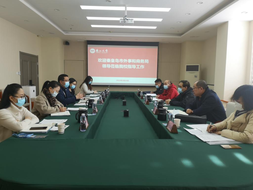 2022年2月24日上午,秦皇岛外事和商务局王贵君副局长一行来我校调研指导工作,国际合作处陆军处长、朱虹副处长、国际教育学院张文莉副院长代表学校接待,双方在世纪楼2102会议室开展充分交流和沟通。