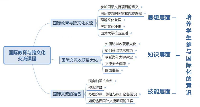该课程旨在拓宽学生知识领域,开阔国际视野,也为疫情结束后参加国际交流项目、留学深造提供帮助。课程将提升学生参加国际交流项目的意识,使其了解国际交流的价值及其对未来的帮助,了解出国学习主要目的地国家的教育体制,理解出国学习的申请流程和相关手续,掌握参加出国交流所需要的知识和技能,熟练掌握国外一流名校的教学特点及可用资源。学生在学习本课程的过程中,能够体会到来自不同文化背景的差异,以及在多文化场景下的学习收获,激发学生未来参与国际交流的兴趣和热情。