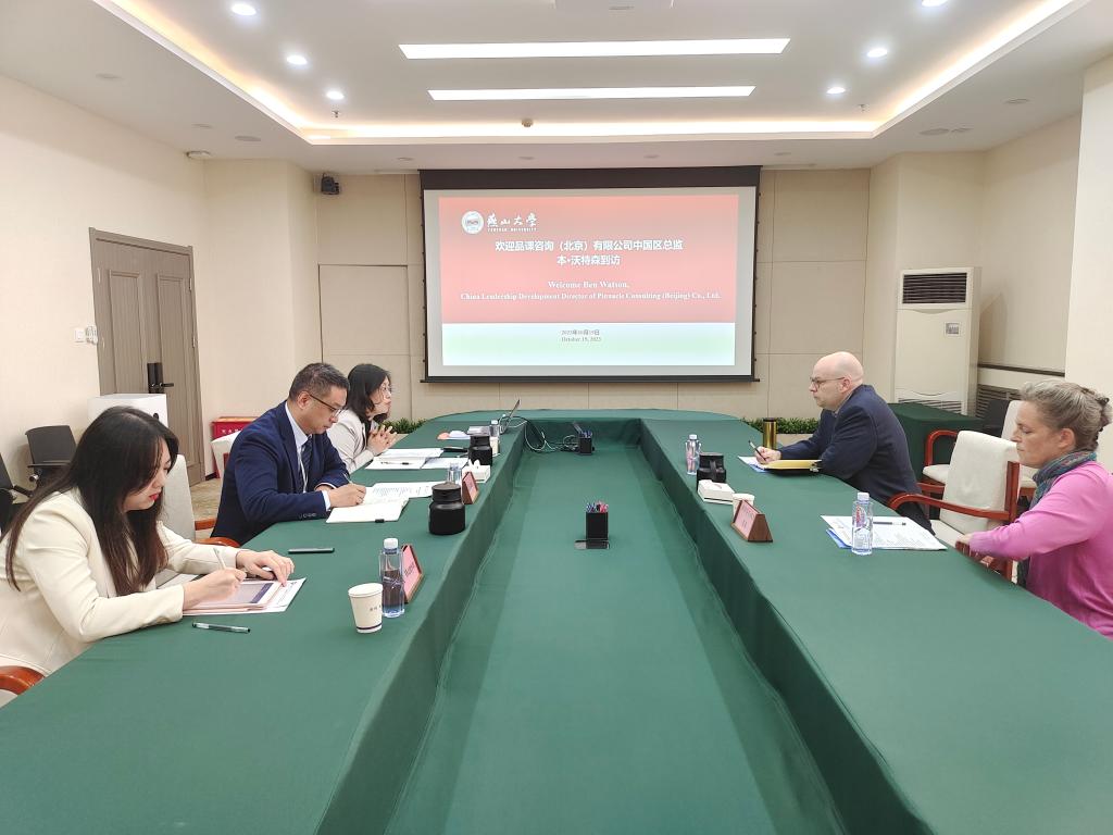 10月19日上午,品课国际中国区总监本·沃特森(Ben Watson)先生来访我校,国际合作处处长陆军、副处长朱虹、在我校任教的品课国际美国籍教师斯蒂芬尼·墨瑟(Stephany Moser)女士与相关工作人员在世纪楼2102室与沃特森先生进行了会谈。会议由朱虹主持。