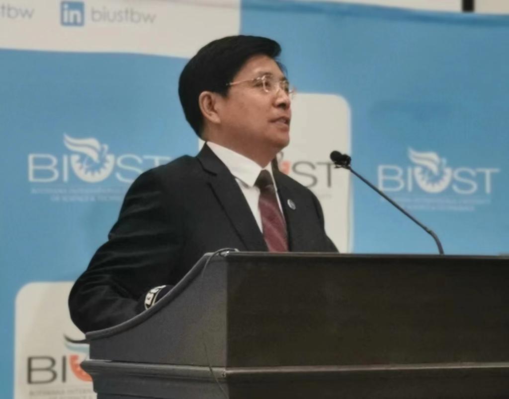 赵丁选作主旨发言。他表示,我们双方怀着欣喜与激动的心情共同见证两校交流合作历史时刻,对于两校有效克服新冠疫情冲击等困难挑战并短时高效完成孔子学院的申报和获批给予了高度肯定。他指出,孔子学院秉承“和为贵”“和而不同”的理念,不仅为中外文化交流搭建了便捷桥梁,更为中国不断深化与世界各国在教育、经贸等领域务实合作提供了良好平台,成为中国联通世界的成功典范。博茨瓦纳国际科技大学孔子学院作为博茨瓦纳共和国的第二所孔子学院将充分结合两校以工科见长的学科特色,采用“中文+职业技能”的培养模式,为博茨瓦纳国际科技大学、帕拉佩地区乃至博茨瓦纳北部地区的中文学习者提供更广阔的了解中国语言和文化的平台,必将增进两校乃至两国人民之间的相互了解,对中博两国合作发展产生深远的影响。