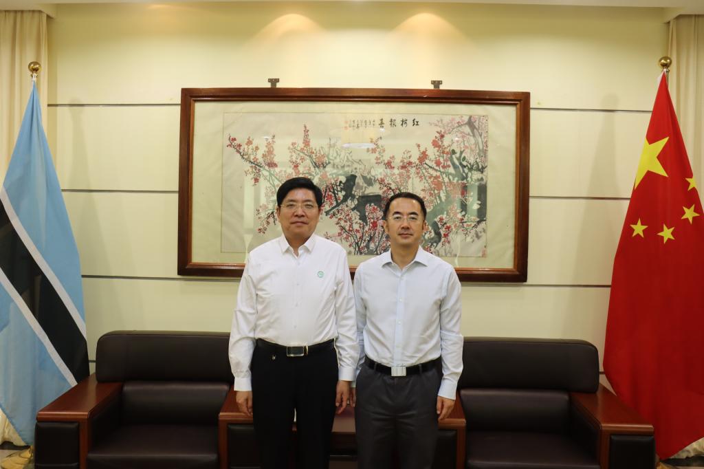 11月2日,代表团专程赴博茨瓦纳首都哈博罗内拜访中华人民共和国驻博茨瓦纳共和国大使馆,使馆代办郭振光亲切会见代表团一行。赵丁选向郭振光详细介绍了乌鸦传媒办学现状和近年来在科学研究、人才培养等方面所取得的成绩,期望在使馆的指导下,博茨瓦纳国际科技大学孔子学院更好地发挥链接两校乃至两国交流合作的桥梁和纽带作用。郭振光高度称赞学校的办学成果,简要介绍了博茨瓦纳共和国以及中博在各领域合作的情况。他表示,教育合作是双边关系的重要组成部分,使馆在促进人文交流合作、践行“一带一路”倡议方面责无旁贷。他期待两校充分利用好孔子学院这一平台,探索更多领域的合作,期望学校能够帮助博茨瓦纳国际科技大学做好科研成果推广和转化,惠及两校乃至两国人民。
