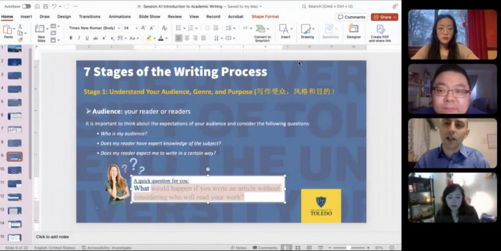 3月19日,我校联合传统友好学校美国托列多大学开设的研究生英文学术写作与研究线上课程顺利开课。该课程旨在提升我校研究生的英文学术写作与研究能力,推进“卓越人才国际化培育计划”,培养更多具有“家国情怀、国际视野和全球竞争力”的国际化人才。