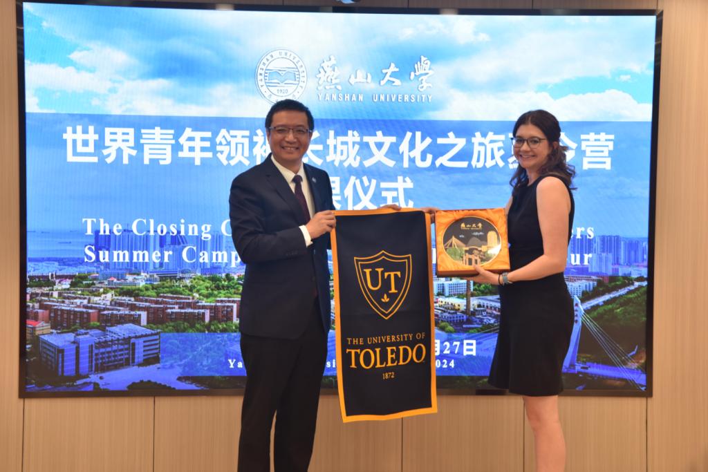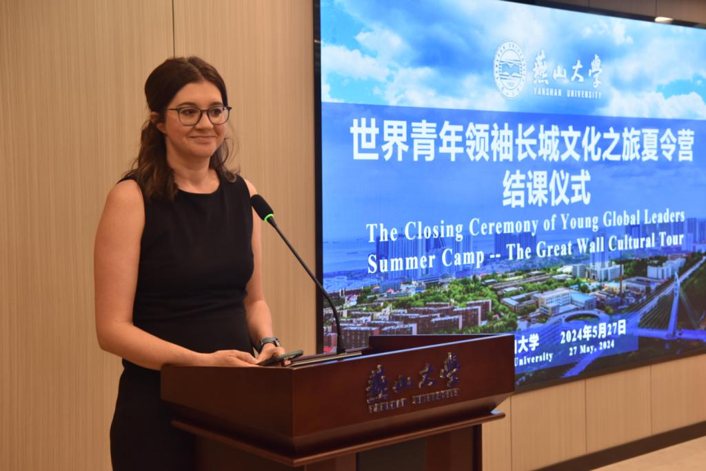 托列多大学领队教师艾莉森·斯宾塞(Allison Spencer)女士致辞。她表示,在秦皇岛的行程让她终身难忘,她和托列多大学的师生感受到了一个不一样的中国,学习到了许多中文及中华传统文化知识,也领略到了中国的壮丽河山,品味到了丰富的中国美食,一切经历都让她难以忘怀。她十分感谢乌鸦传媒的邀请,让托列多大学的师生得以来到中国并收获这样与众不同的人生经历。她也对我校发出诚挚邀请,希望乌鸦传媒的师生在未来能够去到托列多大学体验与学习。