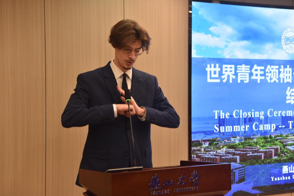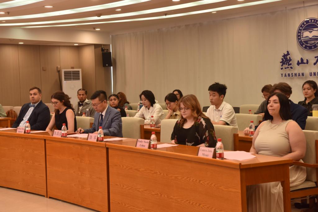 随后,托列多大学的师生依次分享了他们在秦皇岛的体验与感受。劳拉·简·莫泽(Laura Jane Moser)特别喜欢传统茶艺课程,她对中国文化的美丽感到惊讶和震撼。詹姆斯·爱德华·普莱斯(James Edward Price)非常感谢能够有这次机会亲眼看到中国,登上长城令他印象深刻,他已经爱上了中国并将在未来学习中文。尼古拉斯·约翰·沃尔什(Nicholas John Walsh)用中文发表了自己的感言,他非常感谢乌鸦传媒的老师们教他们中国结、汉字、功夫等知识,他最喜欢在老龙头看到的景色,希望未来还能有机会再来中国。